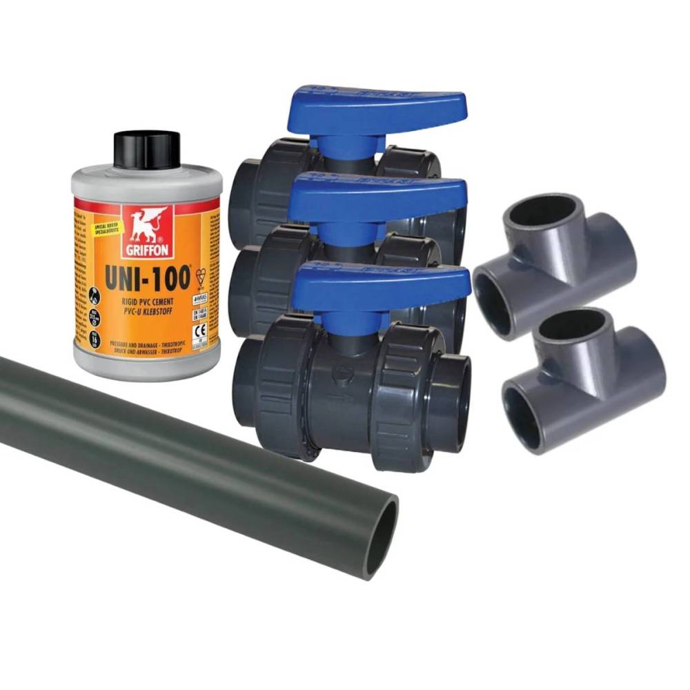 Bypass do pompy ciepła - Effast to profesjonalny zestaw instalacyjny, który umożliwia pełną kontrolę przepływu wody w instalacji basenowej z podłączoną pompą ciepła. Rozwiązanie to jest niezbędne zarówno na etapie pierwszego uruchomienia, jak i podczas eksploatacji czy serwisowania urządzenia. Bypass pozwala na szybkie odłączenie pompy ciepła od obiegu wody, regulację przepływu przez wymiennik oraz całkowite zamknięcie przepływu, np. na czas zimowania lub konserwacji. Zestaw Effast bazuje na wysokiej jakości armaturze PVC-U w rozmiarze d50 (50 mm), co czyni go kompatybilnym z większością standardowych instalacji basenowych.